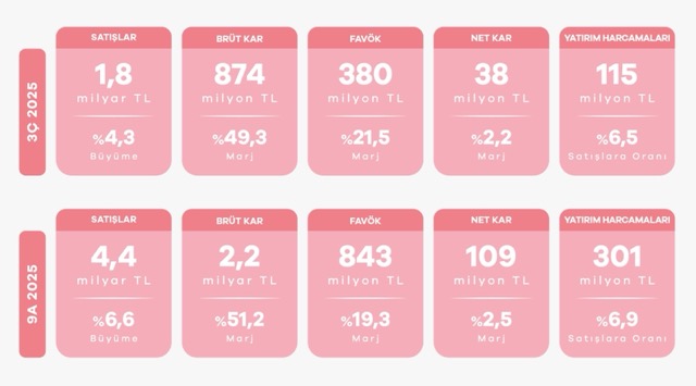 Üçüncü çeyrekte FAVÖK (Faiz, Amortisman ve Vergi Öncesi Kâr) %4,9 artışla 380 milyon TL olarak gerçekleşti. FAVÖK marjı ise yıllık bazda sınırlı bir artışla %21,5 seviyesine yükseldi. Dokuz aylık dönemde toplam FAVÖK 843 milyon TL’ye ulaşarak şirketin operasyonel gücünü bir kez daha ortaya koydu.